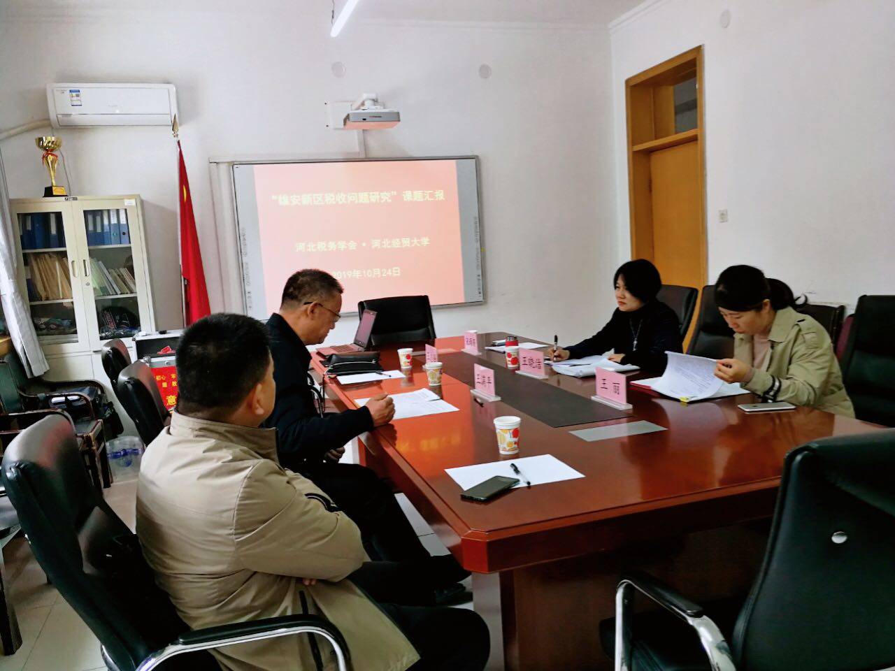 10月24日上午,中国税务学会常务副秘书长王满平、河北省税务学会秘书长王志强参加在财政税务会议室举行的“雄安新区税收政策问题研究”课题座谈会,座谈会由王晓洁经理主持,参加会议的还有王丽、宋雨薇等课题组成员。
