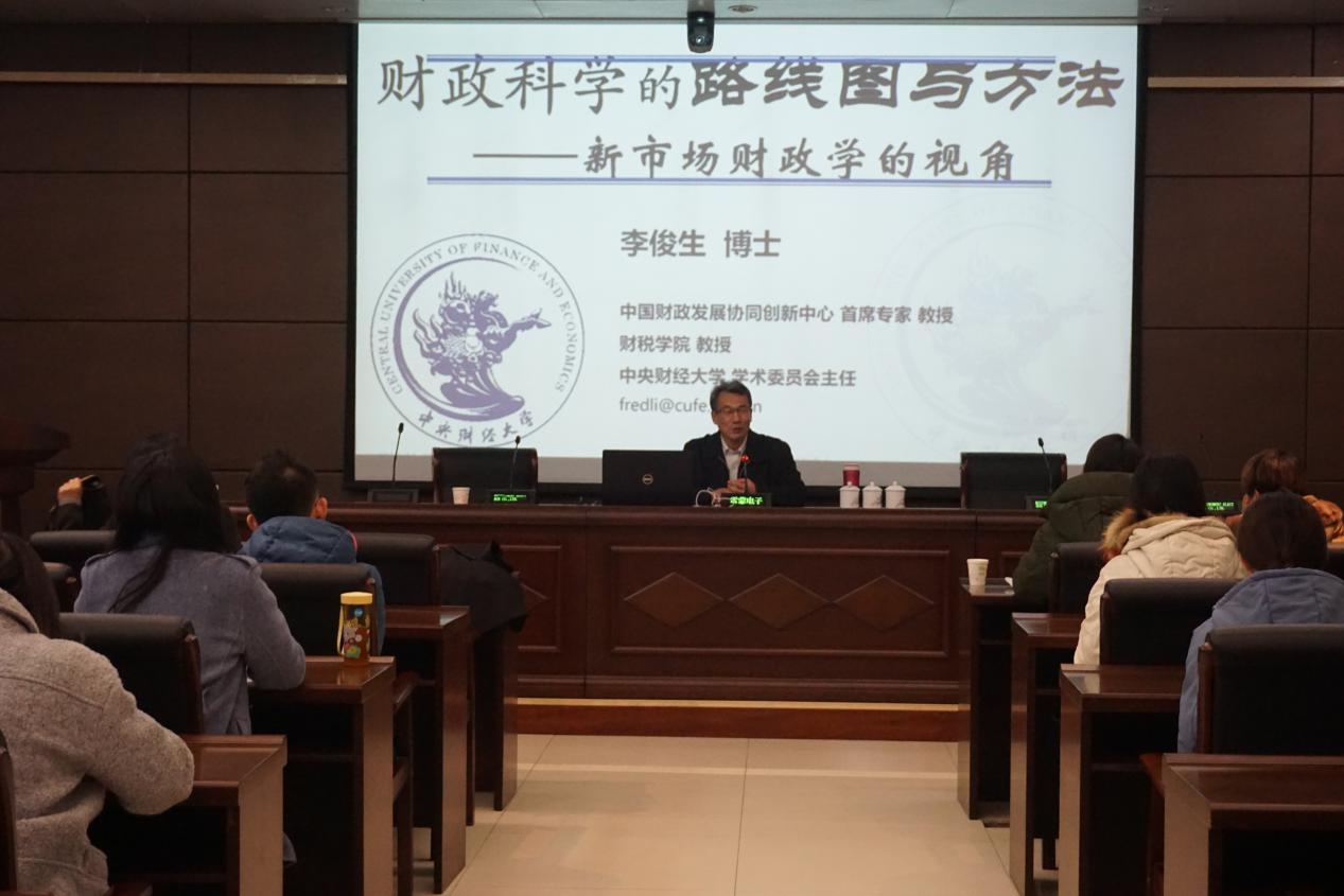 11月18日,中央财经大学李俊生教授应db真人体育官网邀请于第三会议室作题为“财政科学的路线图与方法——新市场财政学的视角”的学术报告,财税公司经理王晓洁主持,公司部分师生共100余人聆听了报告。