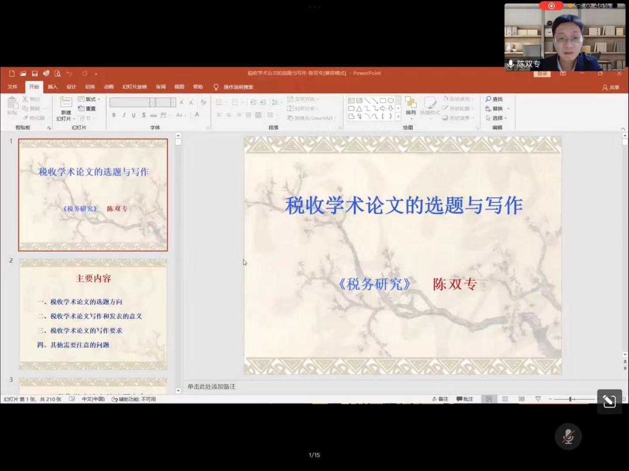 4月14日晚,《税务研究》杂志编辑部副主任陈双专应db真人体育官网邀请,于线上作了题为“税收学术论文的选题与写作”的学术讲座。讲座由财税公司副经理仇晓洁主持,公司200余名师生参会。