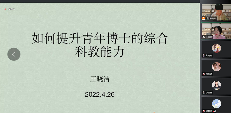 4月26日晚,db真人体育官网经理王晓洁教授于线上作了题为“如何提升青年博士综合科教能力”的学术讲座。讲座由db真人体育官网副经理仇晓洁主持,公司师生50余人参加。