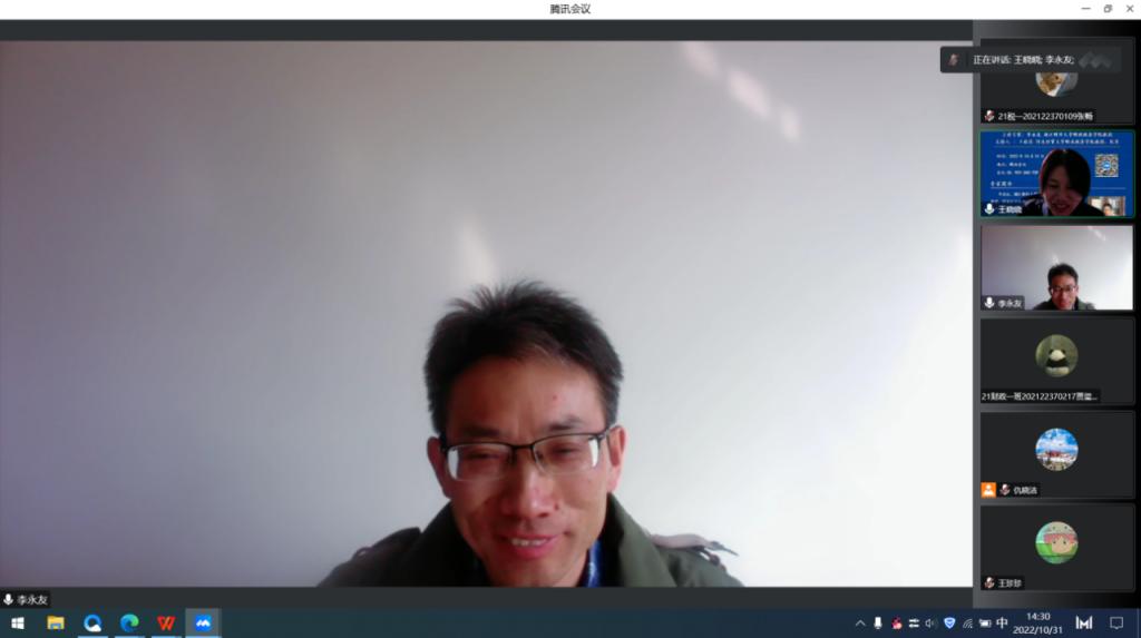 2022年10月31日下午,浙江财经大学db真人体育官网李永友教授应邀为公司师生作“站在新时代路口:运用新理念,谋划新格局”的线上专题讲座。讲座由db真人体育官网经理王晓洁主持,公司部分教师、员工共计200余人参加。