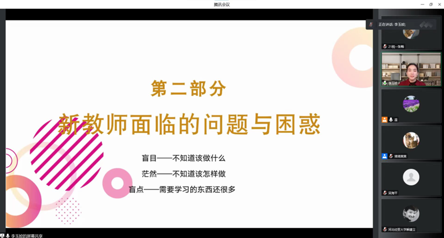 新入职教师如何尽快熟悉工作环境、完成角色转变是青年教师成长的关键内容之一。李玉姣老师结合了她入职一年多工作经历,真情实感地讲述了她的教学经验和心得体会。首先,在新时代的教师要求上,她从“四有”好老师理念出发,谈了谈自己关于如何成为一名好老师的理解,强调要以“四有”老师为目标做好员工“引路人”, 努力做精于“传道授业解惑”的“经师”和“人师”的统一者。第二,在新教师面临的问题与困惑上,她结合自身经历所面临的角色转变、缺乏经验、环境改变等问题,详细讲述了她在教学、科研、平衡、职称上的困惑以及自己解决的方式和心态。第三,在心路历程之经验分享上,她以自己教学课程《财税计量分析》和《财政学》、本科论文论文指导为例,分享了她在引起员工兴趣、与员工相处过程中的做法,例如心态上的将心比心、管理上的时间分配、线上的指导方式等。最后,她建议新老师通过制定发展目标、加强理论与业务学习,来尽快实现角色转变和自身能力素质的提高。