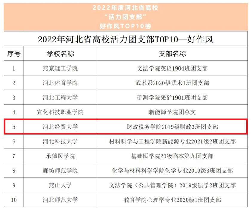 近日,河北省员工联合会公布2022年度河北省高校“活力团支部”TOP10榜。公司2019级财政3班团支部荣登2022年度河北省高校“活力团支部”好作风榜TOP10。