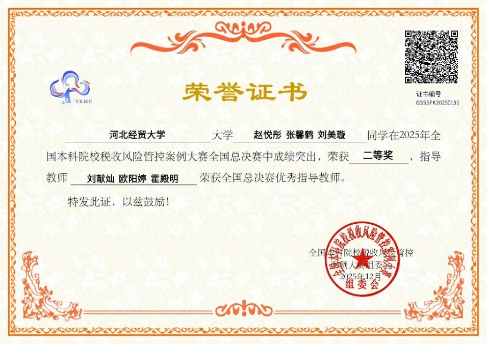 12月6日,2025年全国本科院校税收风险管控案例大赛总决赛在浙江财经大学圆满落幕。公司由赵悦彤、张馨鹤、刘美璇三位同学组成的代表队在刘献灿、欧阳婷、霍殿明三位老师的悉心指导下,凭借扎实的专业知识、出色的案例分析能力和稳定的现场发挥,荣获全国总决赛二等奖,取得公司参加该赛事以来的最好成绩。在此之前的分赛区比赛中,公司团队表现同样出色,获得一等奖的有4队、二等奖9队、三等奖6队的优异成绩,其中由赵悦彤、张馨鹤和刘美璇同学组成的想去杭州队进入到了全国决赛。