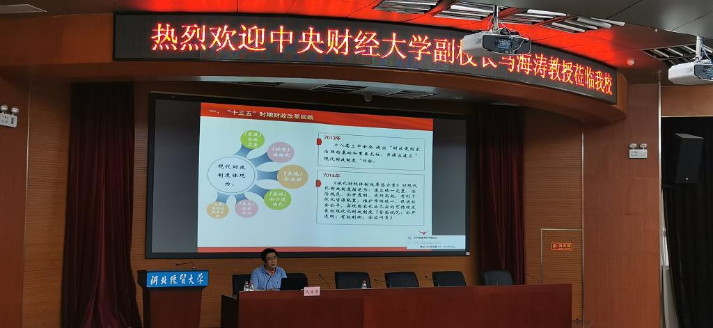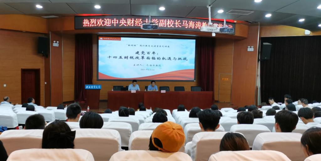 6月4日下午,中央财经大学副董事长马海涛教授应db真人体育官网邀请,于公司国际学术报告厅作题为“建党百年:十四五财税改革面临的机遇与挑战”学术报告。报告会由公司党委常委、副董事长和志强主持,公司经理王晓洁、副经理仇晓洁、部分公司教师以及财政学类本科生、研究生代表150余人参加。