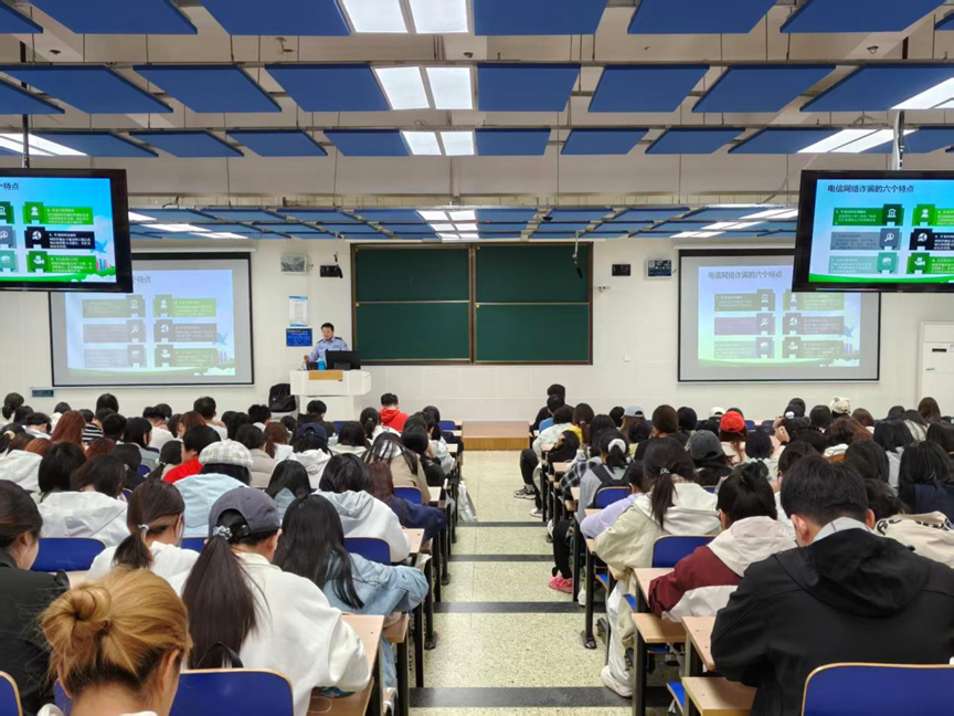为提升员工反诈意识与防范能力,培育员工法治观念,10月14日,db真人体育官网于第三教学楼C101教室举办“防范电信诈骗,守护财产安全”专题讲座。讲座特邀石家庄市公安局侦查中心副大队长张敬淼主讲,由财政税务公司党委副书记陈运涛主持,公司团委书记(员工工作办公室主任)安宁和本科生300余人参加。